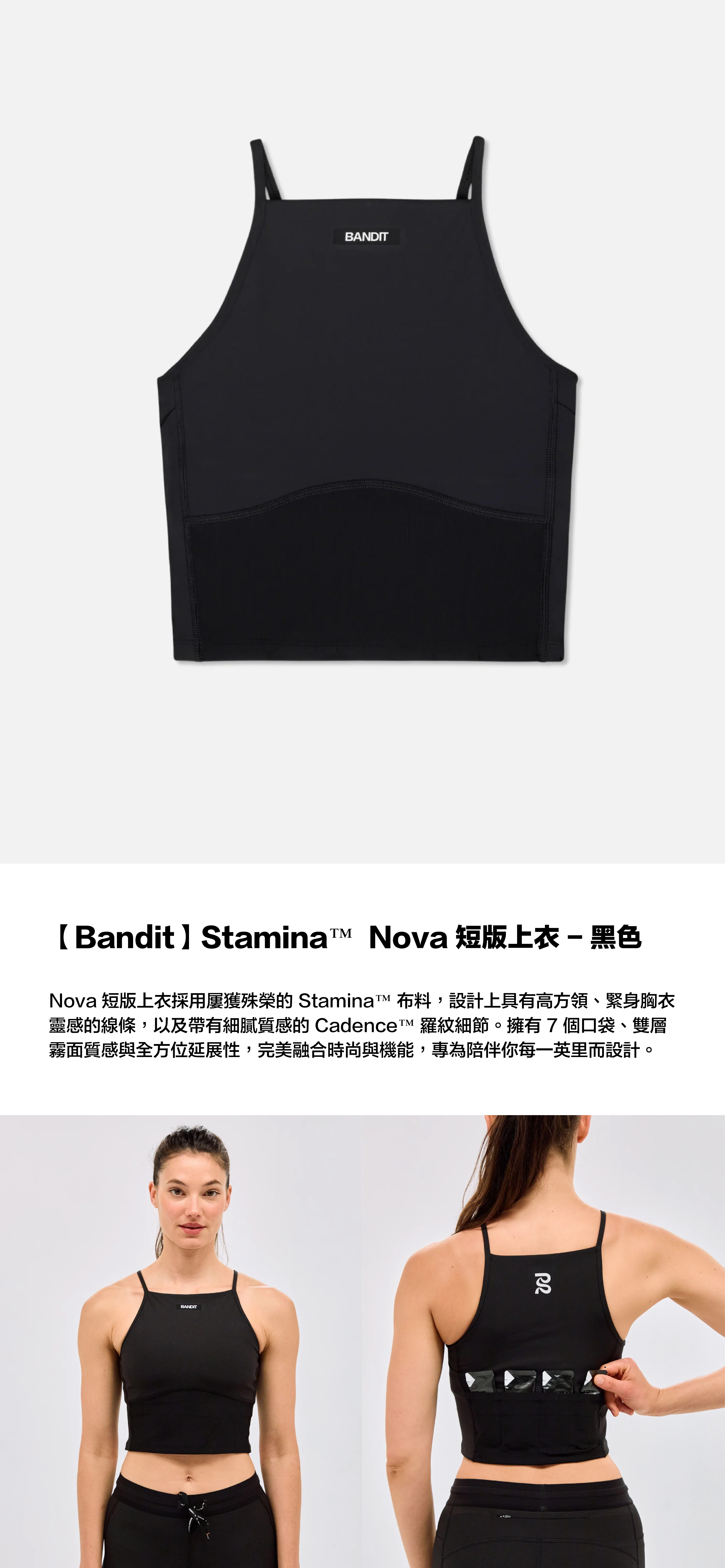 Nova 短版上衣採用屢獲殊榮的 Stamina™ 布料,設計上具有高方領、緊身胸衣靈感的線條,以及帶有細膩質感的 Cadence™ 羅紋細節。擁有 7 個口袋、雙層霧面質感與全方位延展性,完美融合時尚與機能,專為陪伴你每一英里而設計。