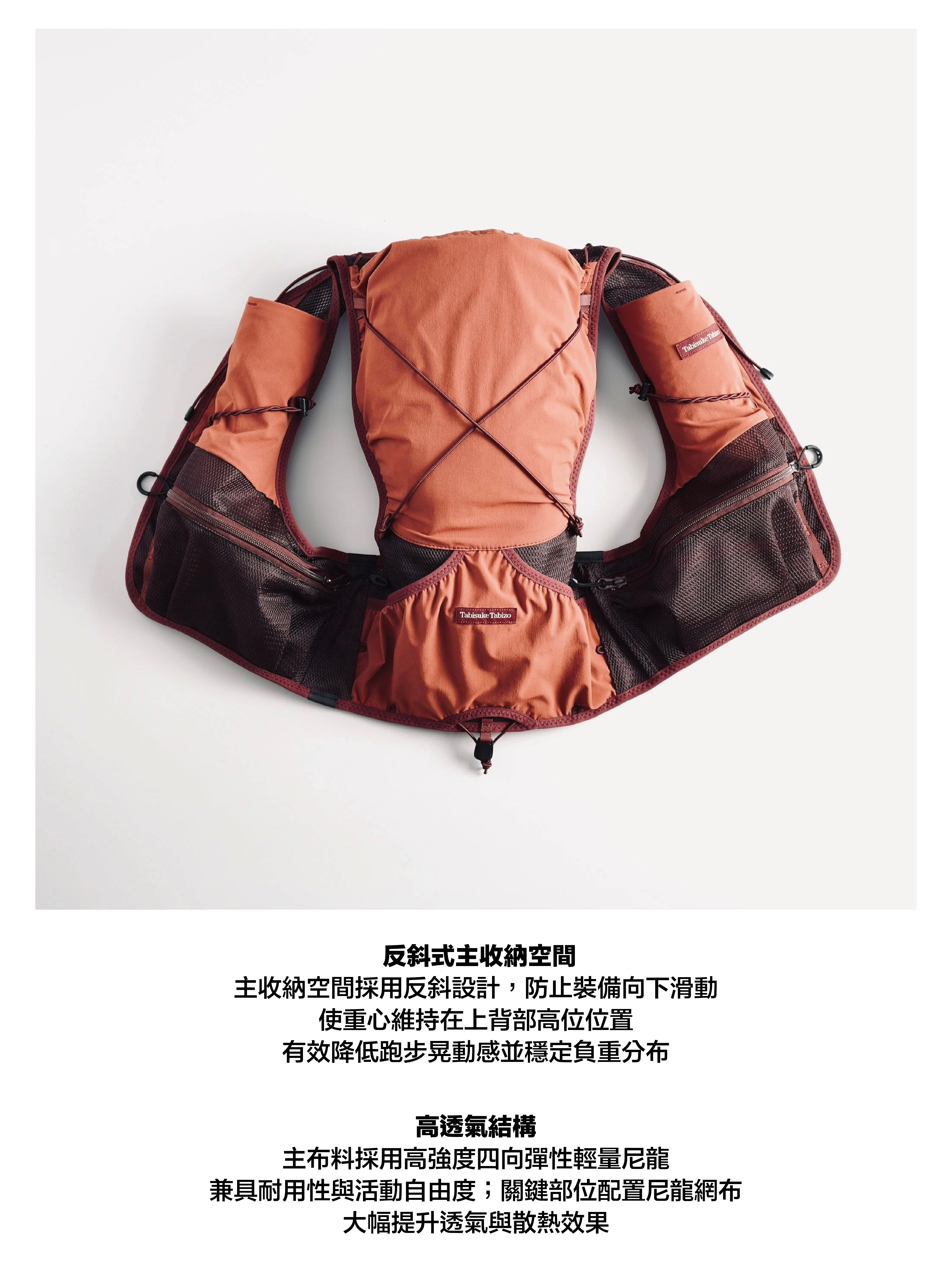這是一款專為越野跑與超級馬拉松優化的 5L 跑步背心,搭載品牌原創的 「T2 High Mount Fit™ 2.0」技術,可將負重穩定舒適地分散於胸腔位置,同時不限制骨盆活動,帶來更自然的跑動體驗。