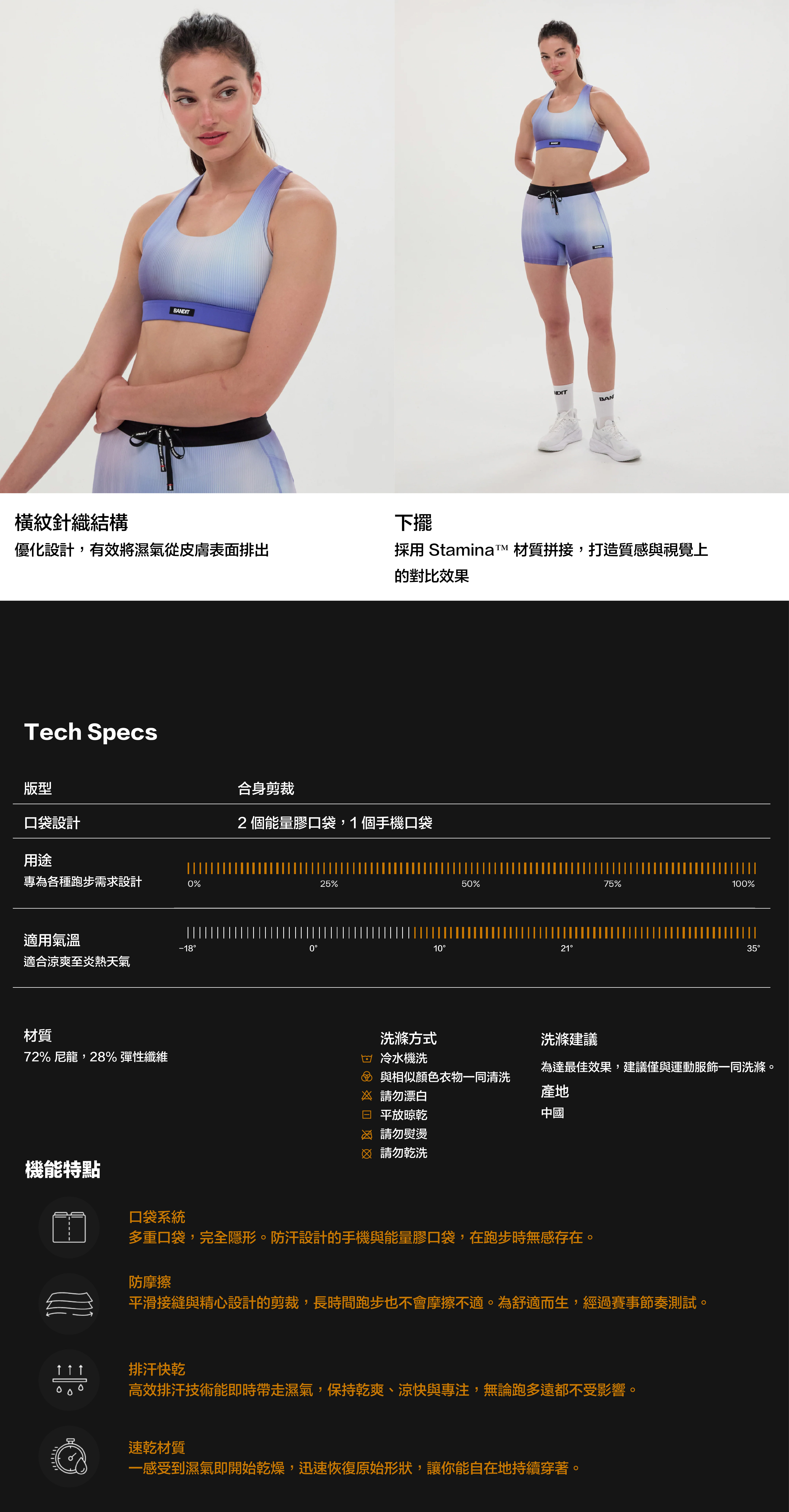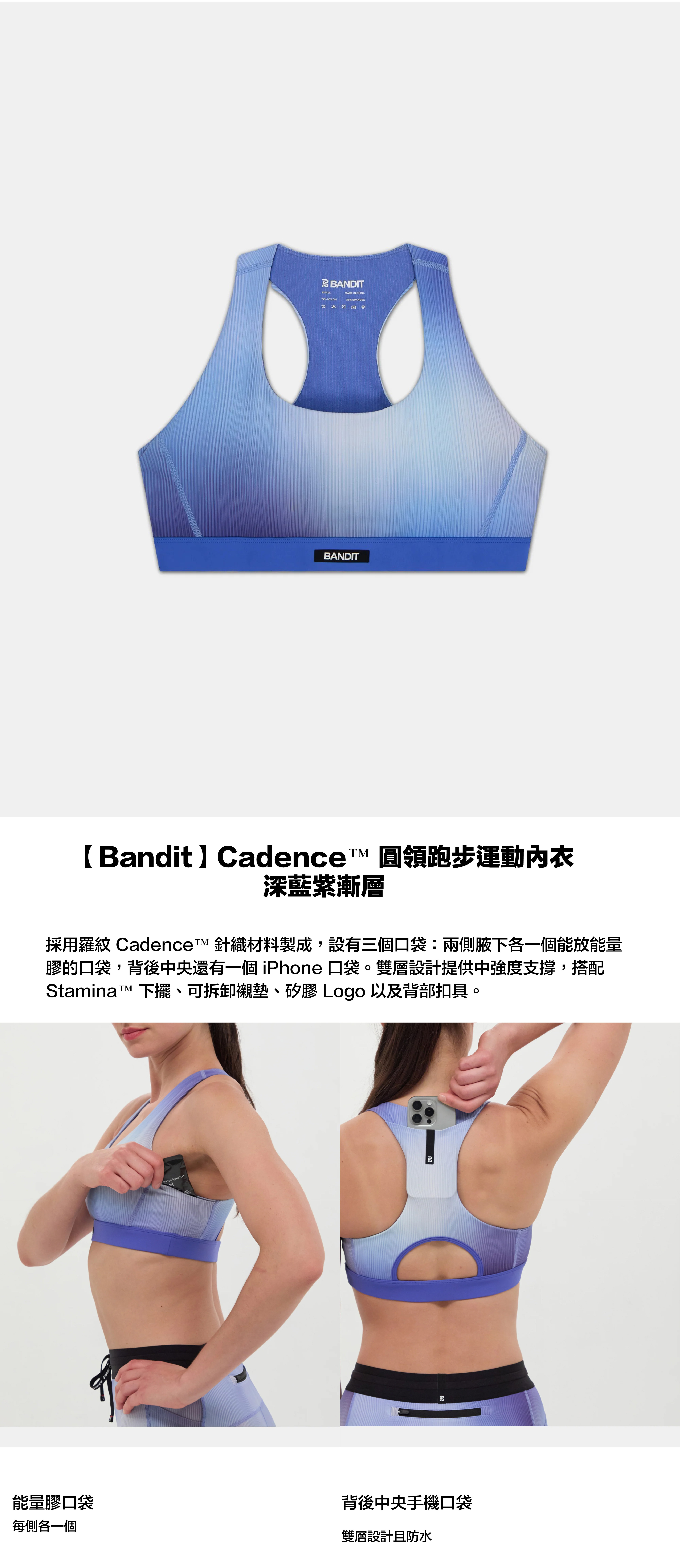 採用羅紋 Cadence™ 針織材料製成,設有三個口袋:兩側腋下各一個能放能量膠的口袋,背後中央還有一個 iPhone 口袋。雙層設計提供中強度支撐,搭配 Stamina™ 下擺、可拆卸襯墊、矽膠 Logo 以及背部扣具。