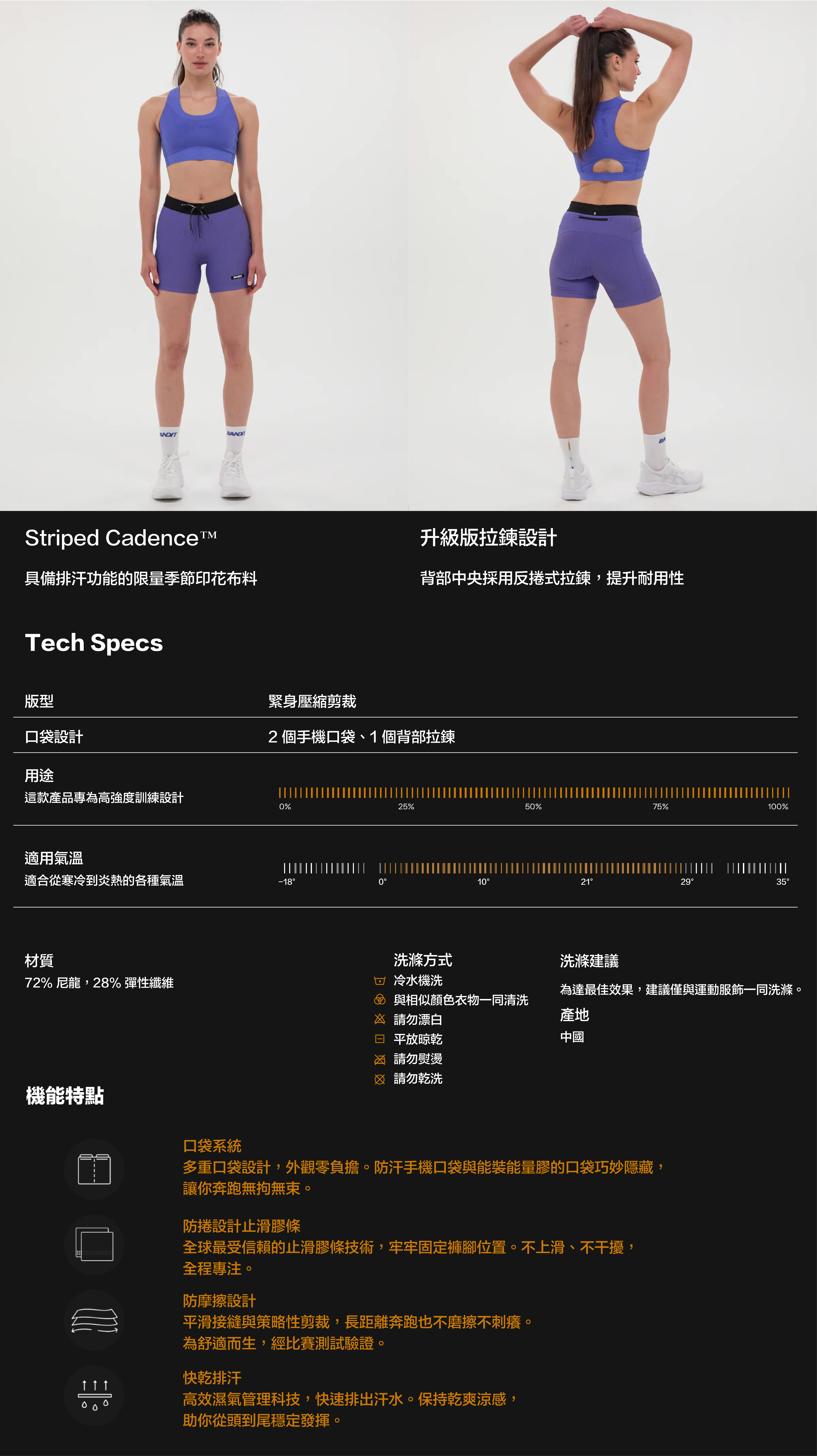 這款 5 吋壓縮短褲採用我們超舒適的 Striped Cadence™ 機能布料製成,前襠無接縫設計,兩側配有防水手機口袋,背後中央還設有一個拉鍊收納口袋。褲腳以義大利止滑膠條收邊,防止捲邊上滑,搭配我們特製的防摩擦腰頭設計,以及低調的矽膠品牌標誌細節。