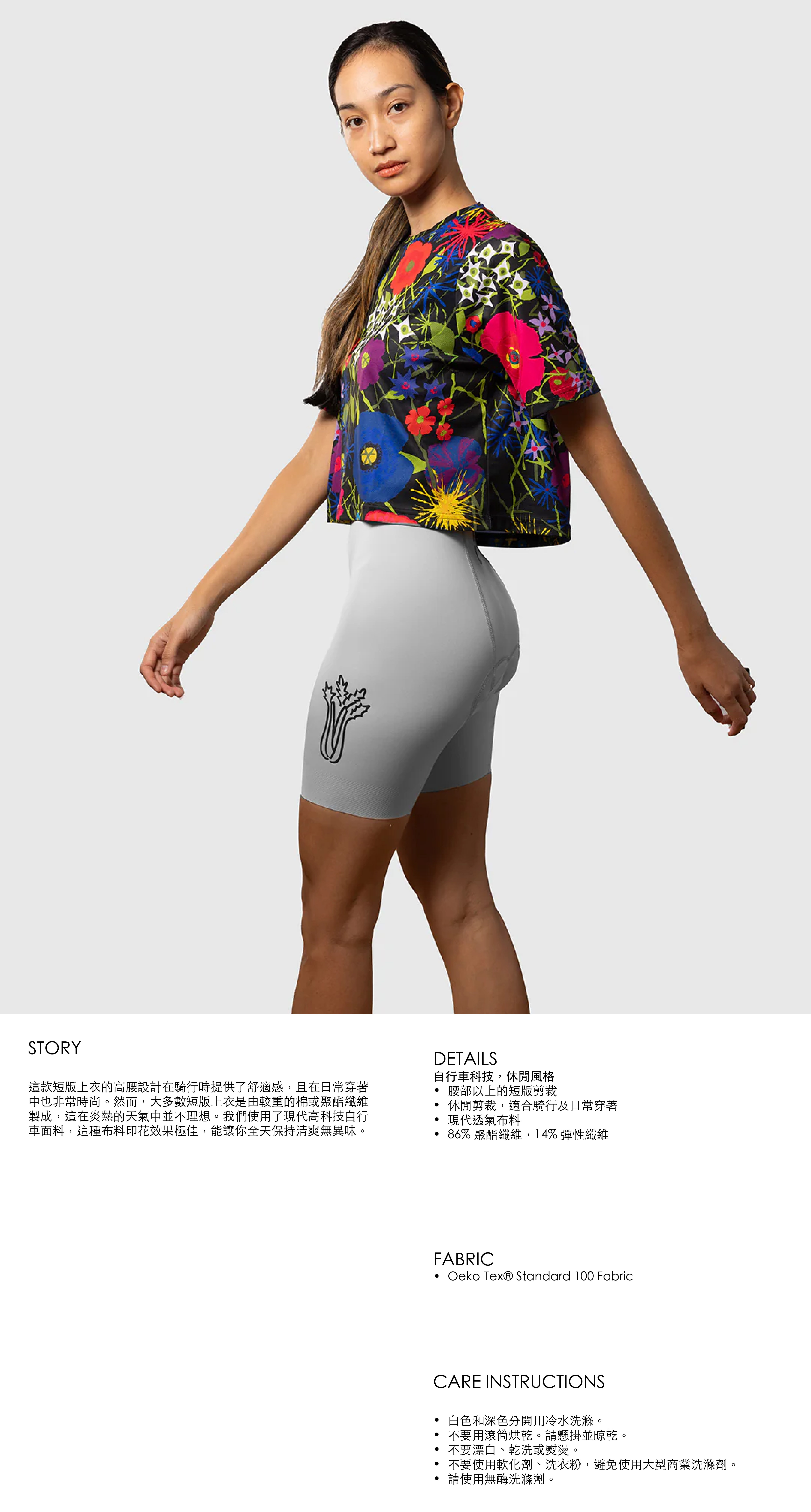 這款短版上衣的高腰設計在騎行時提供了舒適感,且在日常穿著中也非常時尚。然而,大多數短版上衣是由較重的棉或聚酯纖維製成,這在炎熱的天氣中並不理想。我們使用了現代高科技自行車面料,這種布料印花效果極佳,能讓你全天保持清爽無異味。