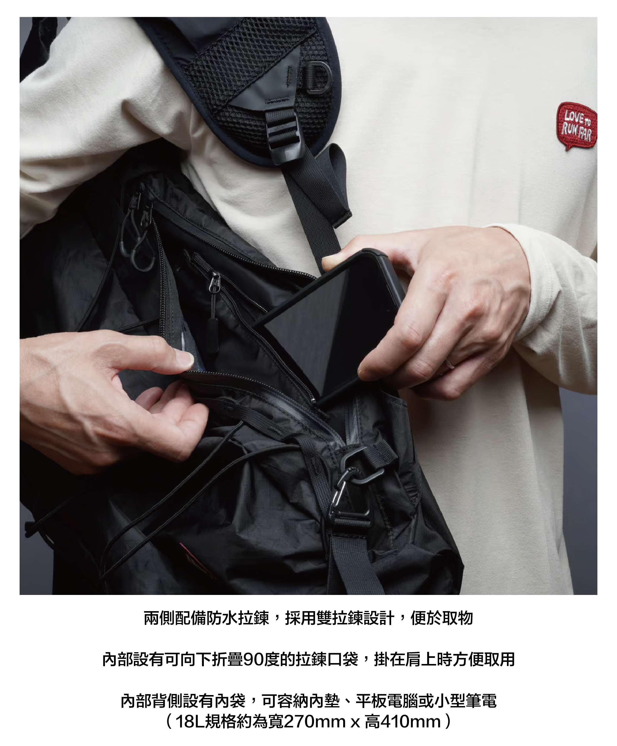 這款18L跑步背包適用於從通勤跑步到快速打包的各種場景。(假設步伐約為5分鐘/公里至6分鐘/公里)
