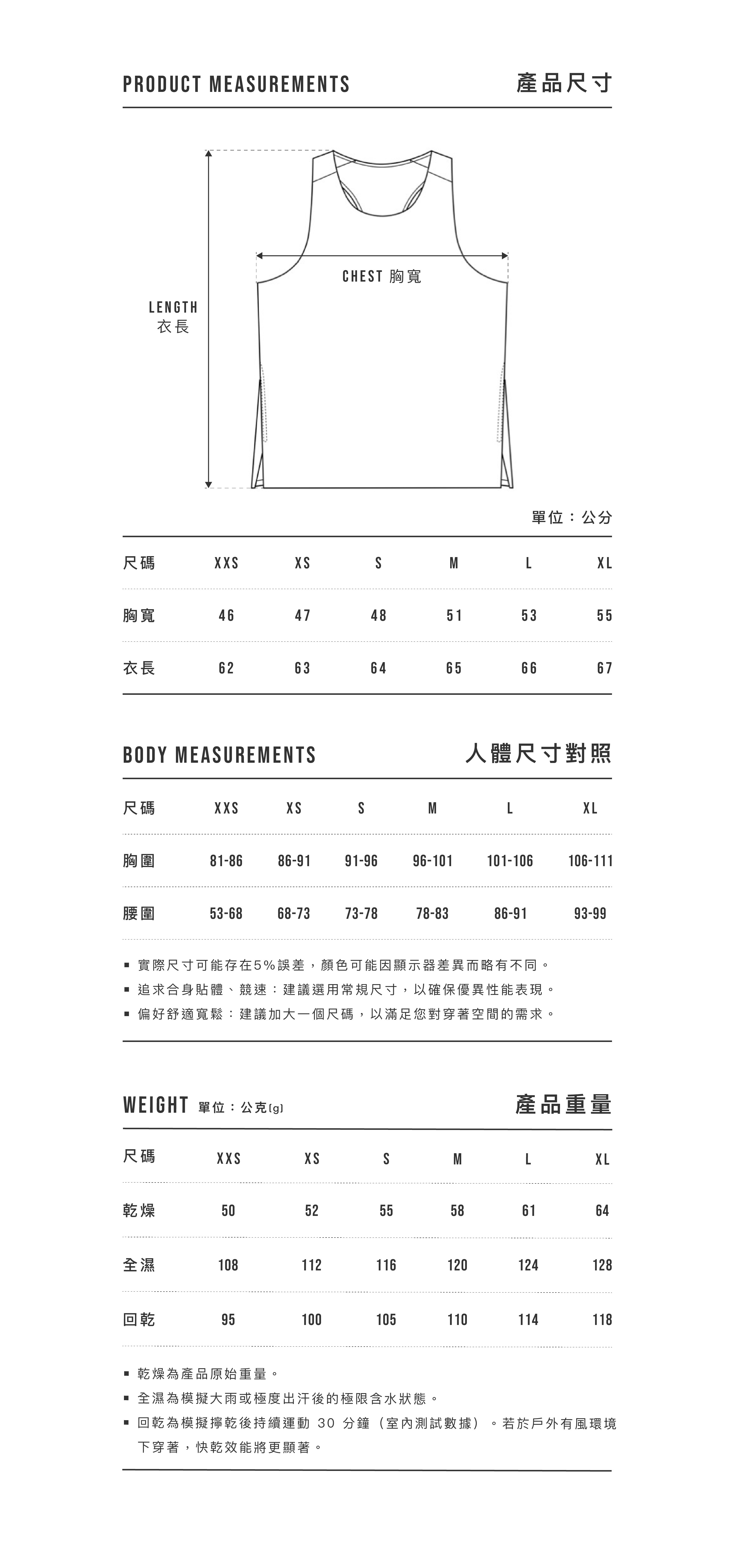 每一個結構細節皆為速度而設計:窄版肩帶與挖背剪裁讓手臂擺動更自由;側邊開衩增加步伐延展;全件採用無貼合結構並取消熱燙印Logo 與洗標,避免摩擦、脫膠與異物感,保持最純粹的輕盈觸感。