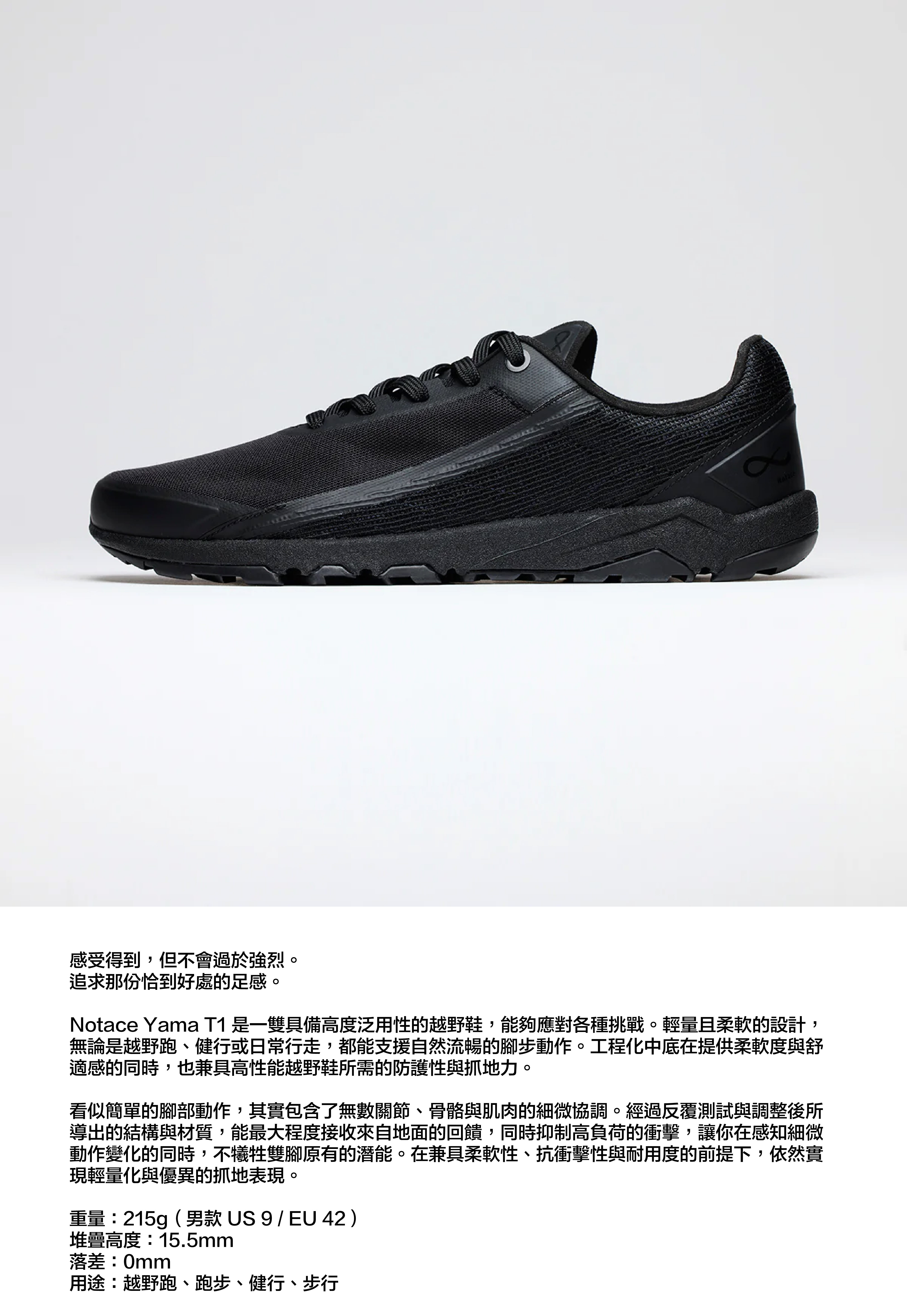 Yama T1 男款是一雙多功能越野跑鞋,能隨著你的步伐前進,無論山徑帶你走向何方都能從容應對。無論是跑步、健行,或只是自在探索戶外,Yama 都能提供全天候的舒適感與穩定抓地力,是你在各種山徑活動中唯一需要的一雙越野鞋。
