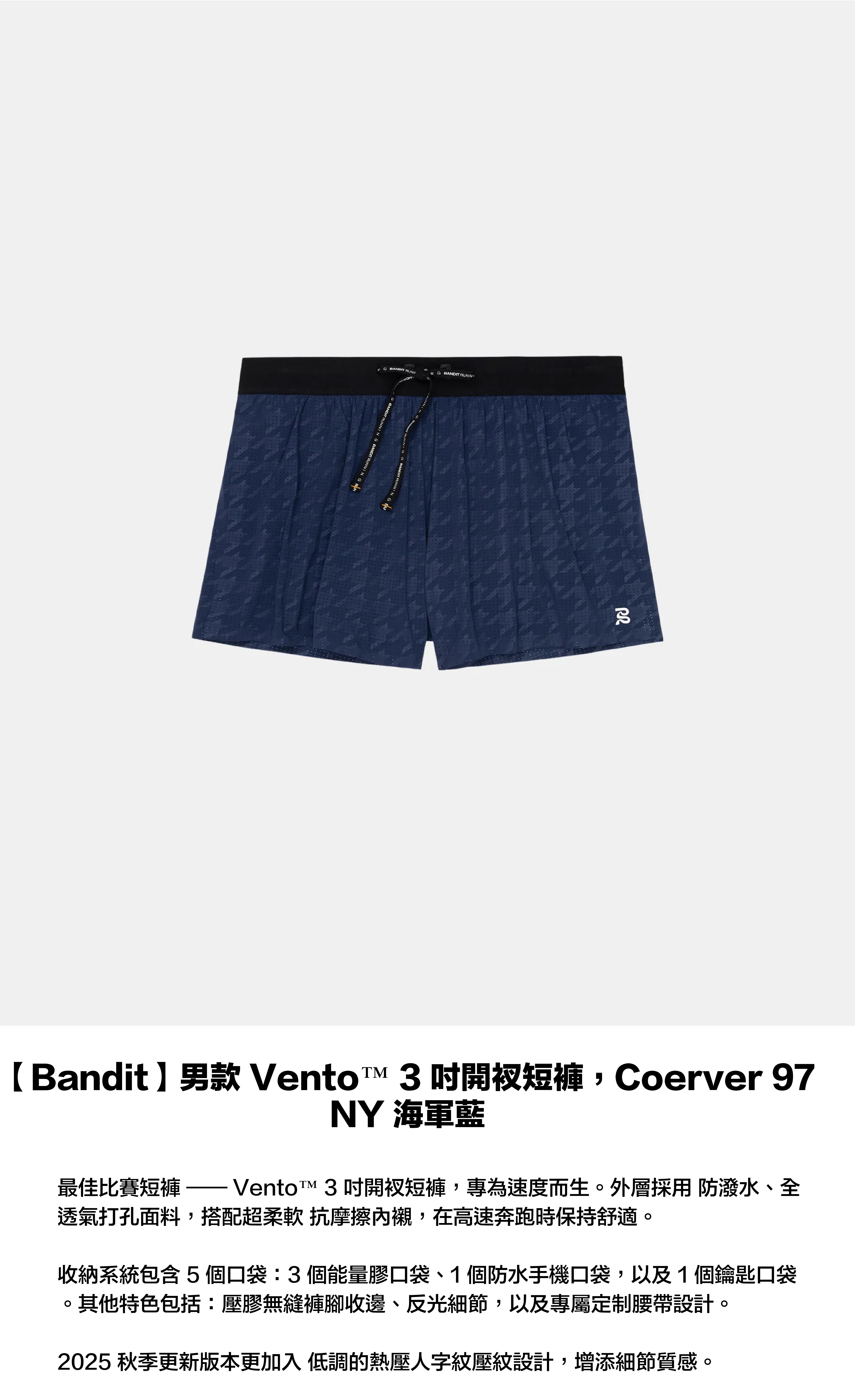 最佳比賽短褲 —— Vento™ 3 吋開衩短褲,專為速度而生。外層採用 防潑水、全透氣打孔布料,搭配超柔軟 抗摩擦內襯,在高速奔跑時保持舒適。