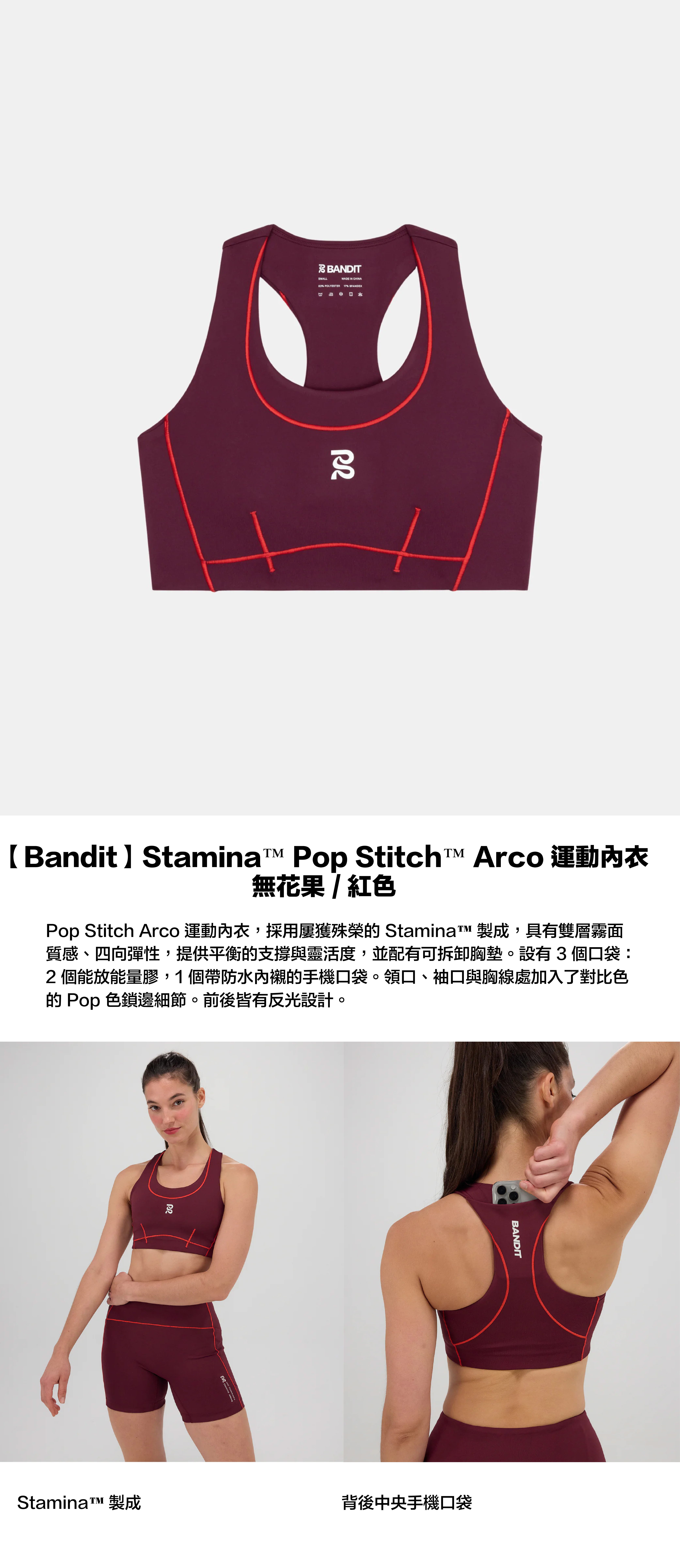 Pop Stitch Arco 運動內衣,採用屢獲殊榮的 Stamina™ 製成,具有雙層霧面質感、四向彈性,提供平衡的支撐與靈活度,並配有可拆卸胸墊。設有 3 個口袋:2 個能放能量膠,1 個帶防水內襯的手機口袋。領口、袖口與胸線處加入了對比色的 Pop 色鎖邊細節。前後皆有反光設計。