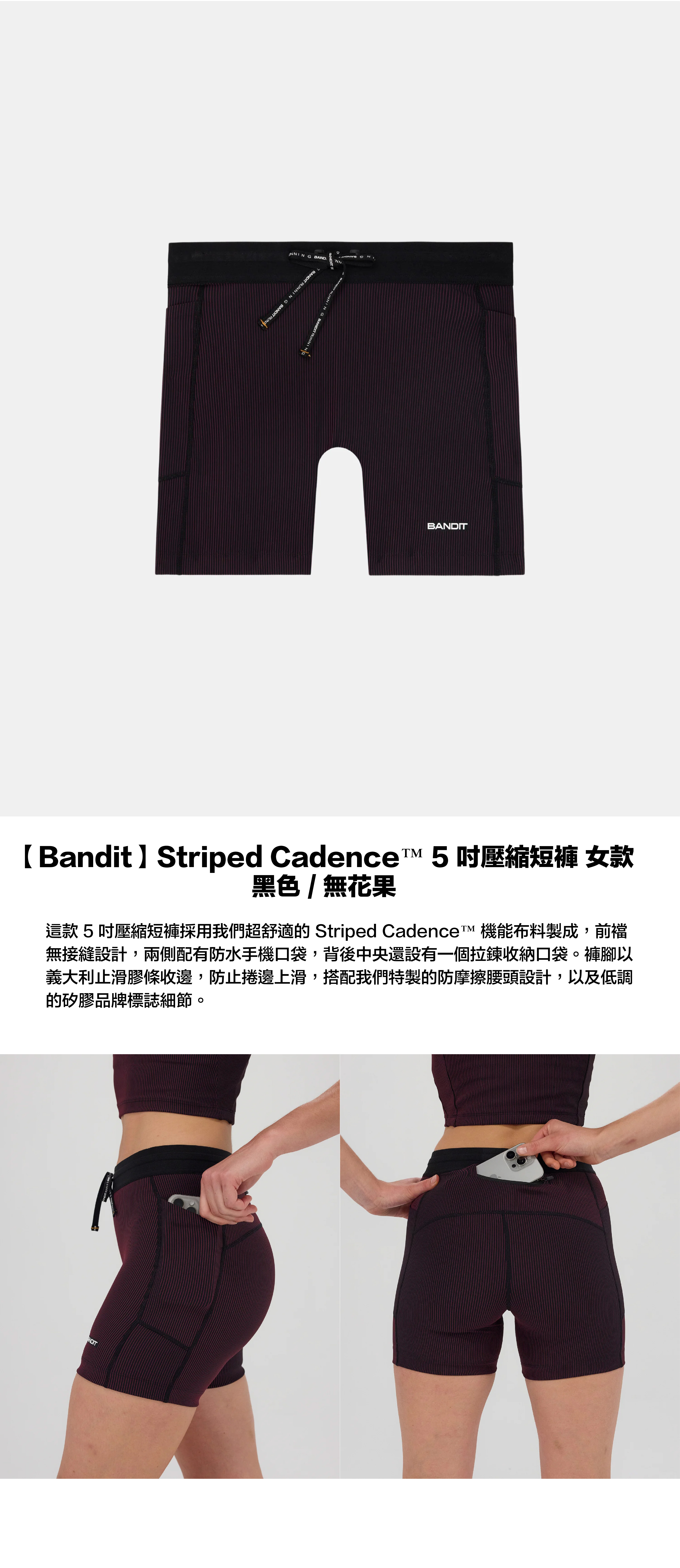 這款 5 吋壓縮短褲採用我們超舒適的 Striped Cadence™ 機能布料製成,前襠無接縫設計,兩側配有防水手機口袋,背後中央還設有一個拉鍊收納口袋。褲腳以義大利止滑膠條收邊,防止捲邊上滑,搭配我們特製的防摩擦腰頭設計,以及低調的矽膠品牌標誌細節。