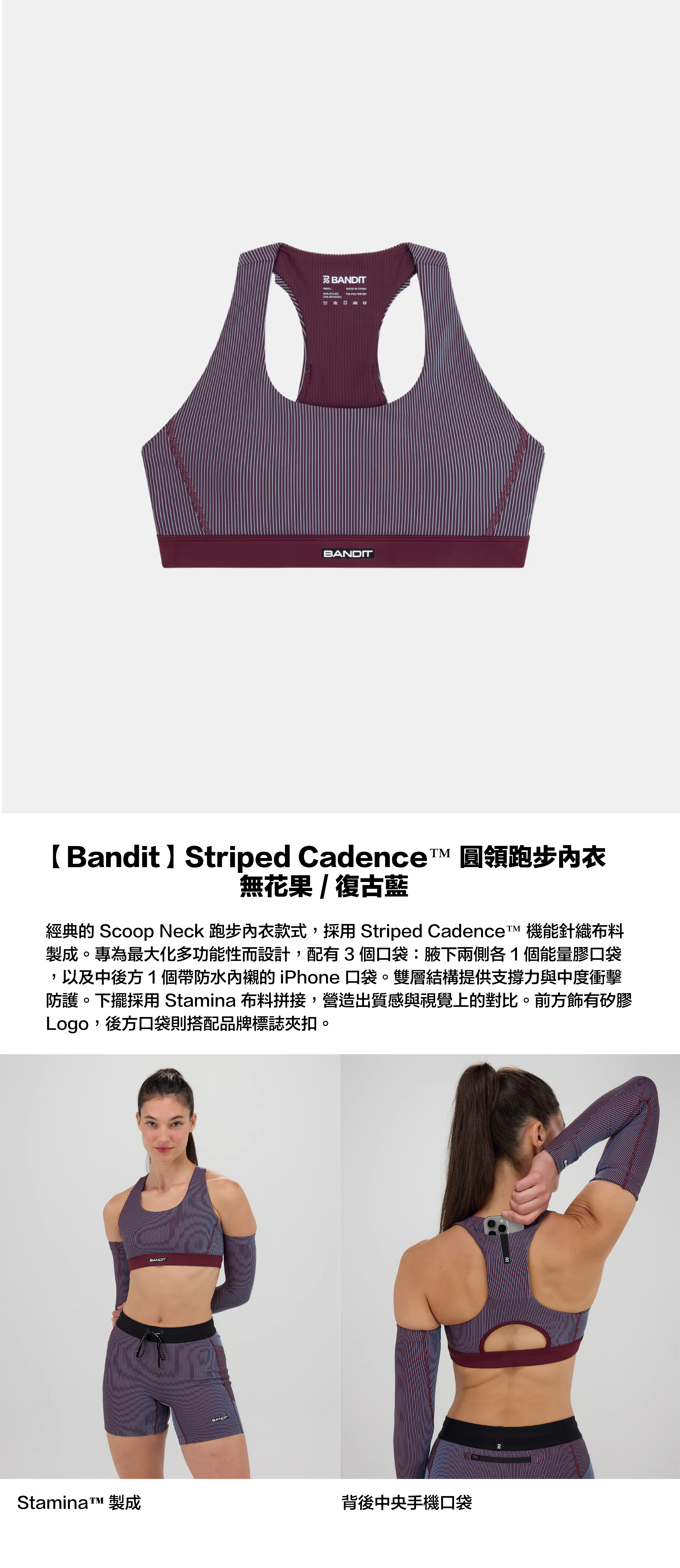 經典的 Scoop Neck 跑步內衣款式,採用 Striped Cadence™ 機能針織布料製成。專為最大化多功能性而設計,配有 3 個口袋:腋下兩側各 1 個能量膠口袋,以及中後方 1 個帶防水內襯的 iPhone 口袋。雙層結構提供支撐力與中度衝擊防護。下擺採用 Stamina 布料拼接,營造出質感與視覺上的對比。前方飾有矽膠 Logo,後方口袋則搭配品牌標誌夾扣。