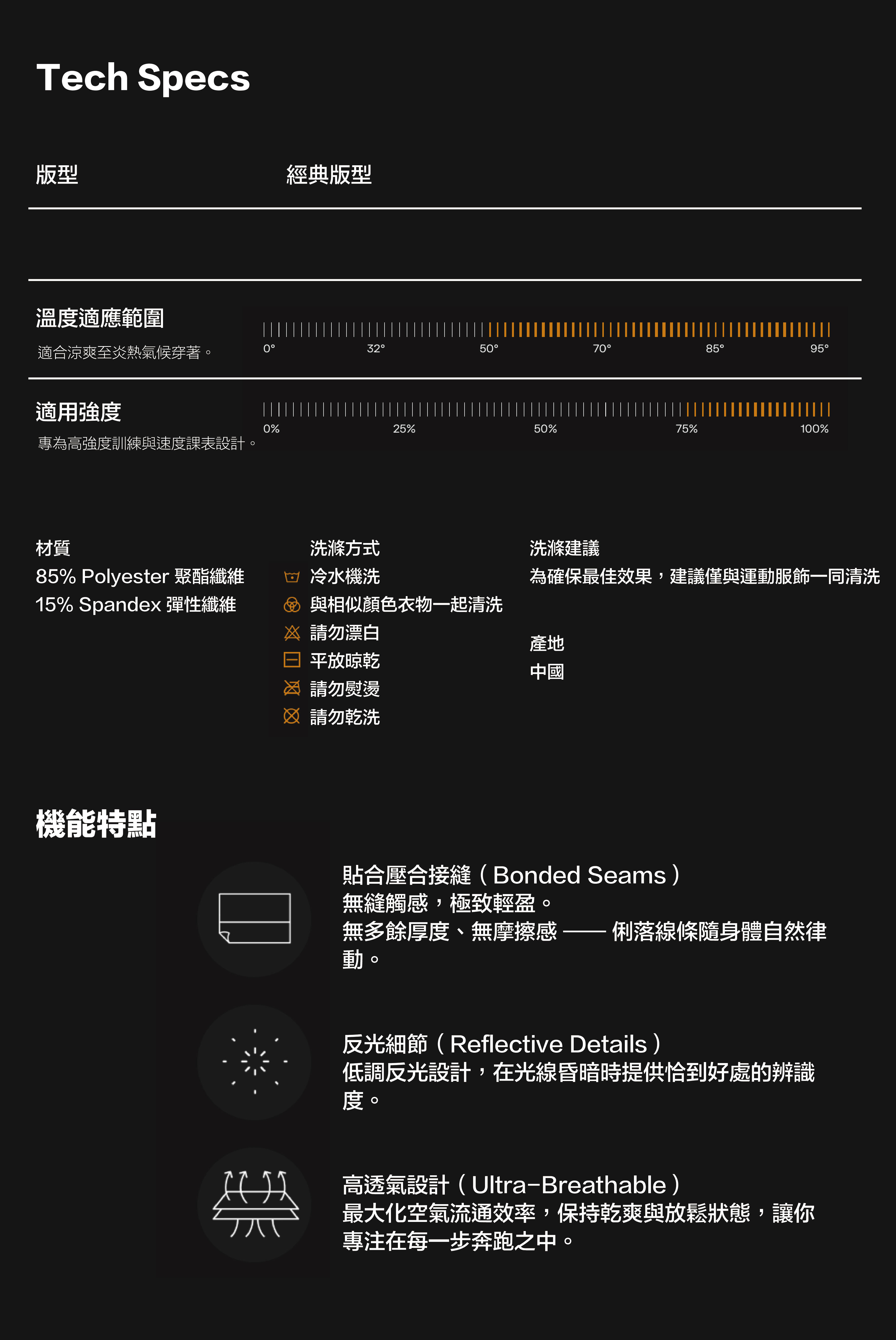 前後身皆配有反光品牌標誌,提升夜跑與清晨訓練時的能見度。